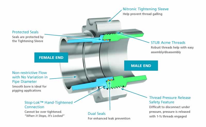 Available in 3/4-, 1-, 1-1/2-, 2- and 3-inch sizes, Stop-Lok? couplers are constructed of 316 stainless steel and have an operational temperature range of -20oF to 400oF (-29oC to 204oC).