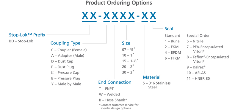 Available in 3/4-, 1-, 1-1/2-, 2- and 3-inch sizes, Stop-Lok? couplers are constructed of 316 stainless steel and have an operational temperature range of -20oF to 400oF (-29oC to 204oC).